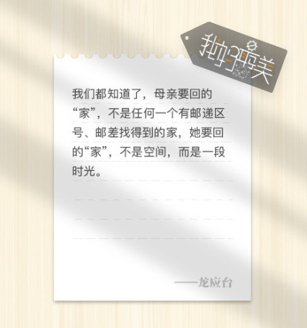 我們都知道了,母親要回的“家”,不是一個(gè)有郵遞區(qū)號(hào)、郵差找得到的家,她要回的“家”,不是空間,而是一段時(shí)光?!薄垜?yīng)臺(tái)