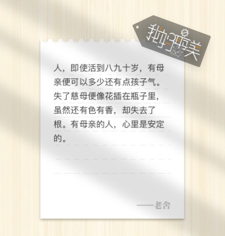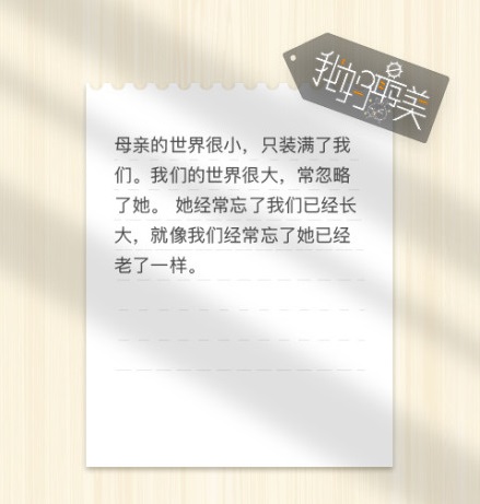 后關(guān)于要送什么禮物給母親。我想,的禮物,是讓她走進(jìn)你的生活,讓她依靠你。做到她養(yǎng)我一小,我陪她終老。